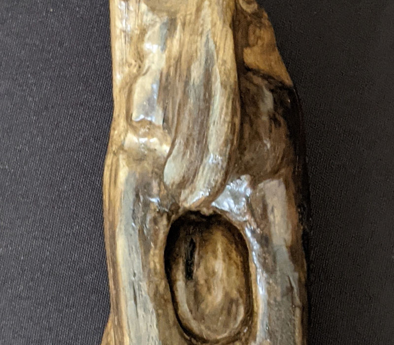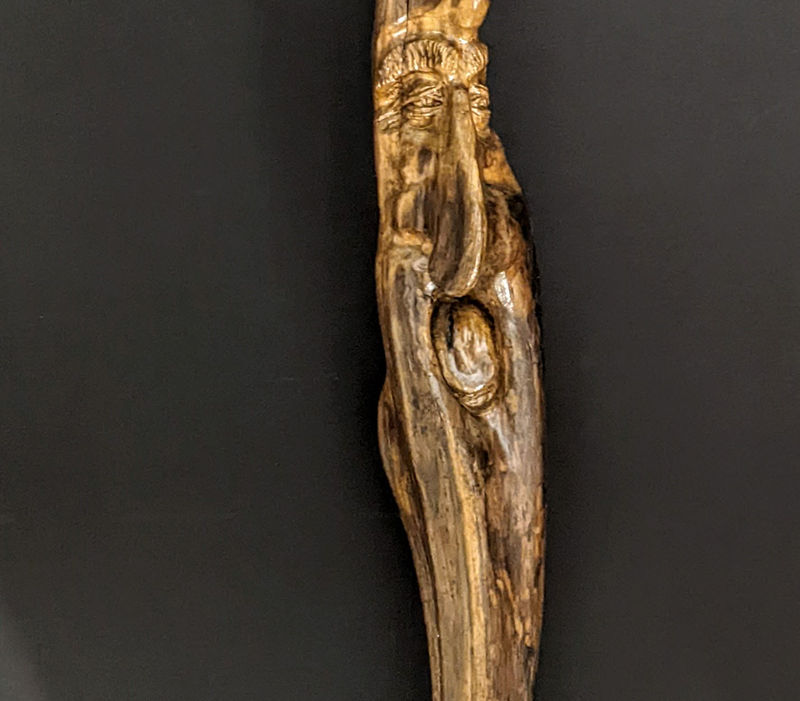 Some carvings aren’t easily explained. Subjects and visual conceptions don’t always appear until after the chips begin to fly. Often the wood dictates the direction J.J. takes as he creates a piece. Many slabs, blocks and sticks, more often than not, have their own ideas of what image hides within.